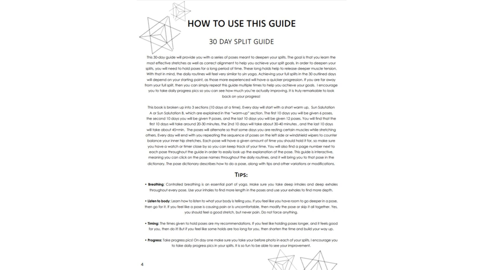 This 30-Day Split Guide will provide you with 30 Days of sequences designed to deepen your splits. The goal is that you learn the most effective stretches as well as correct alignment to help you achieve your flexibility goals.